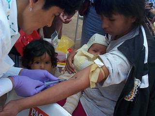 | 採血中(シャーガス病の検査用) | 新生児の採血検査(採血はサシガメが・・。) |