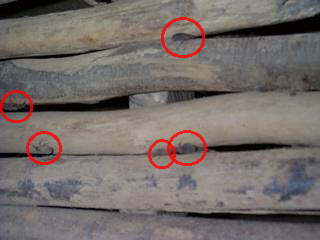 | ベッドの下木(サシガメが一杯:赤丸) | リーシュマニアの患部(痛くはないらしい) |